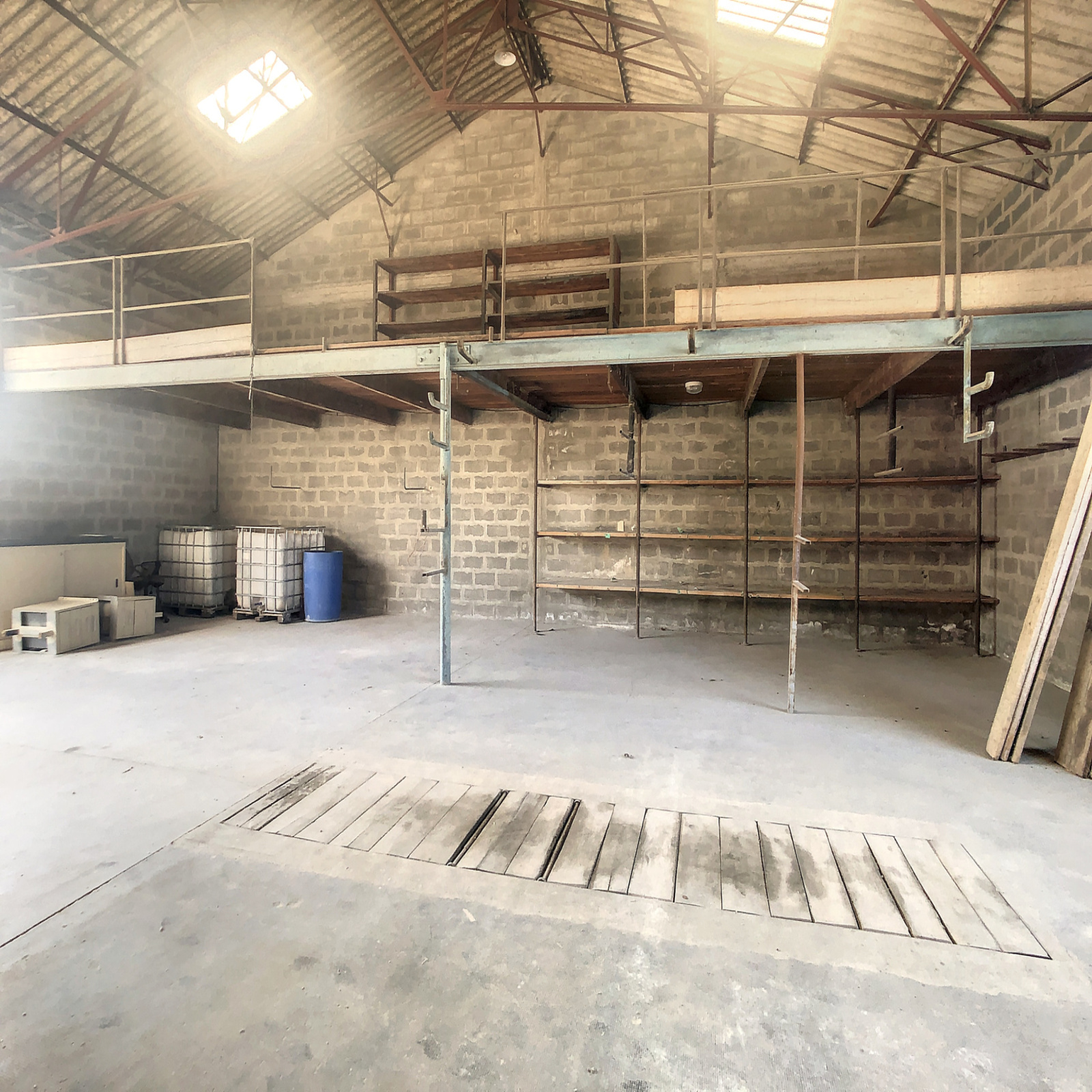 Entrepôt de stockage d'une superficie de 150 m² avec mezzanine.
