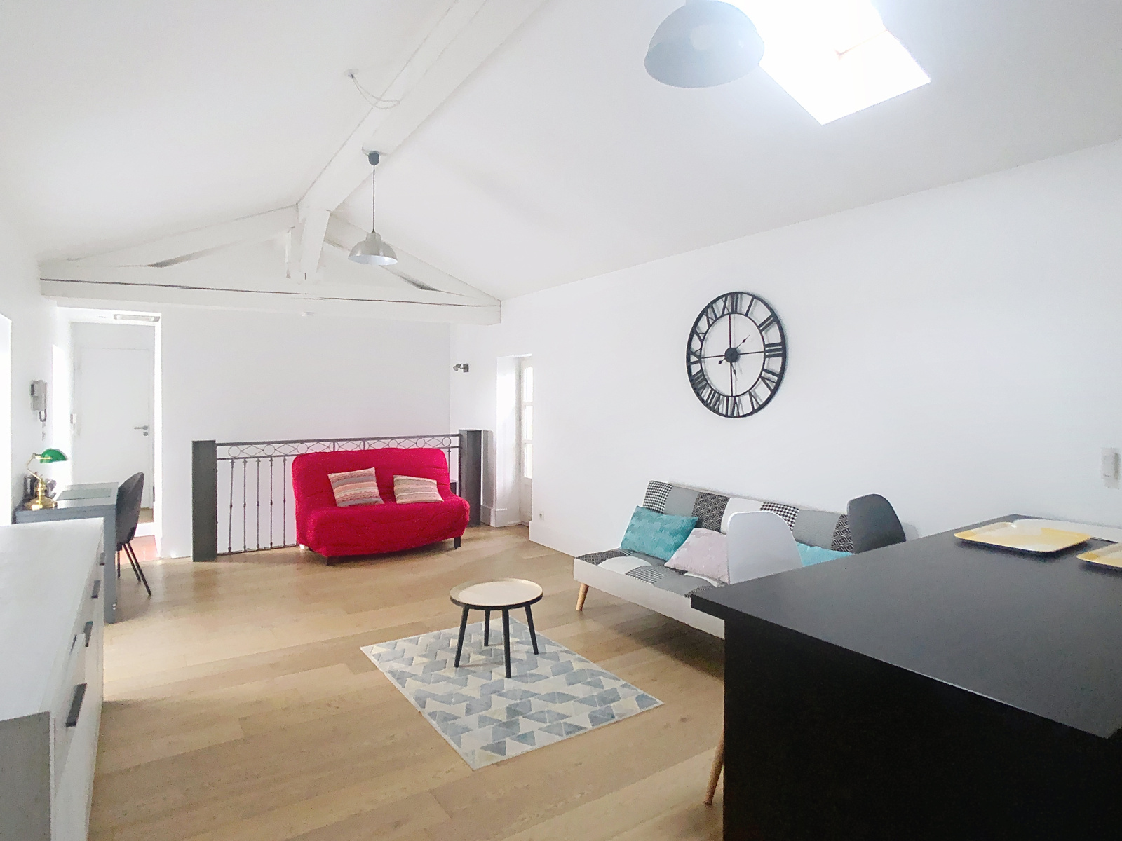 Salon avec cuisine américaine équipée, salle d'eau, grande chambre.