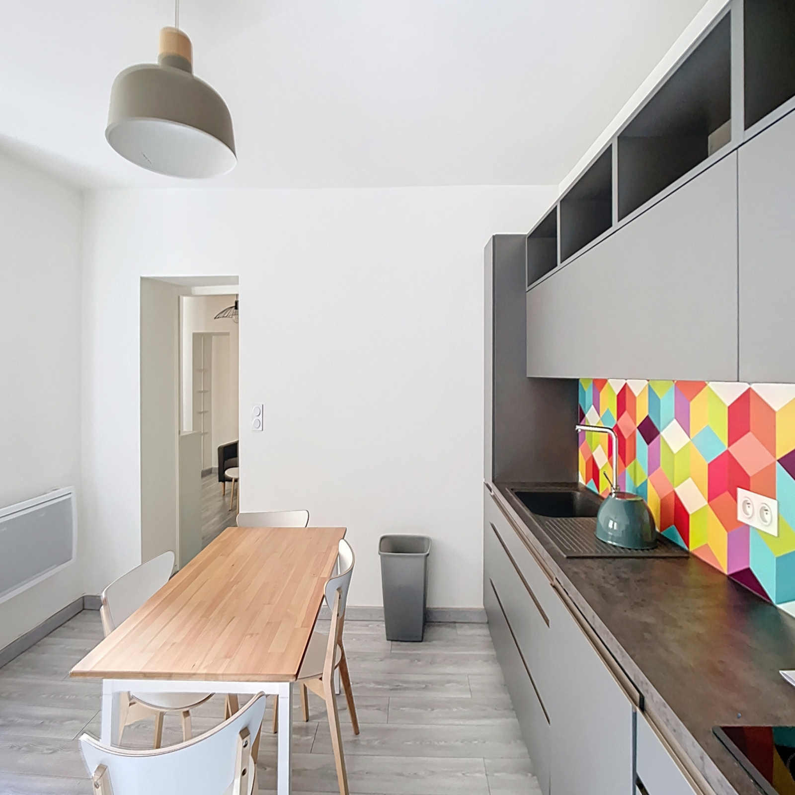 Grande cuisine indépendante, salon avec dressing, chambre, salle d'eau/wc.