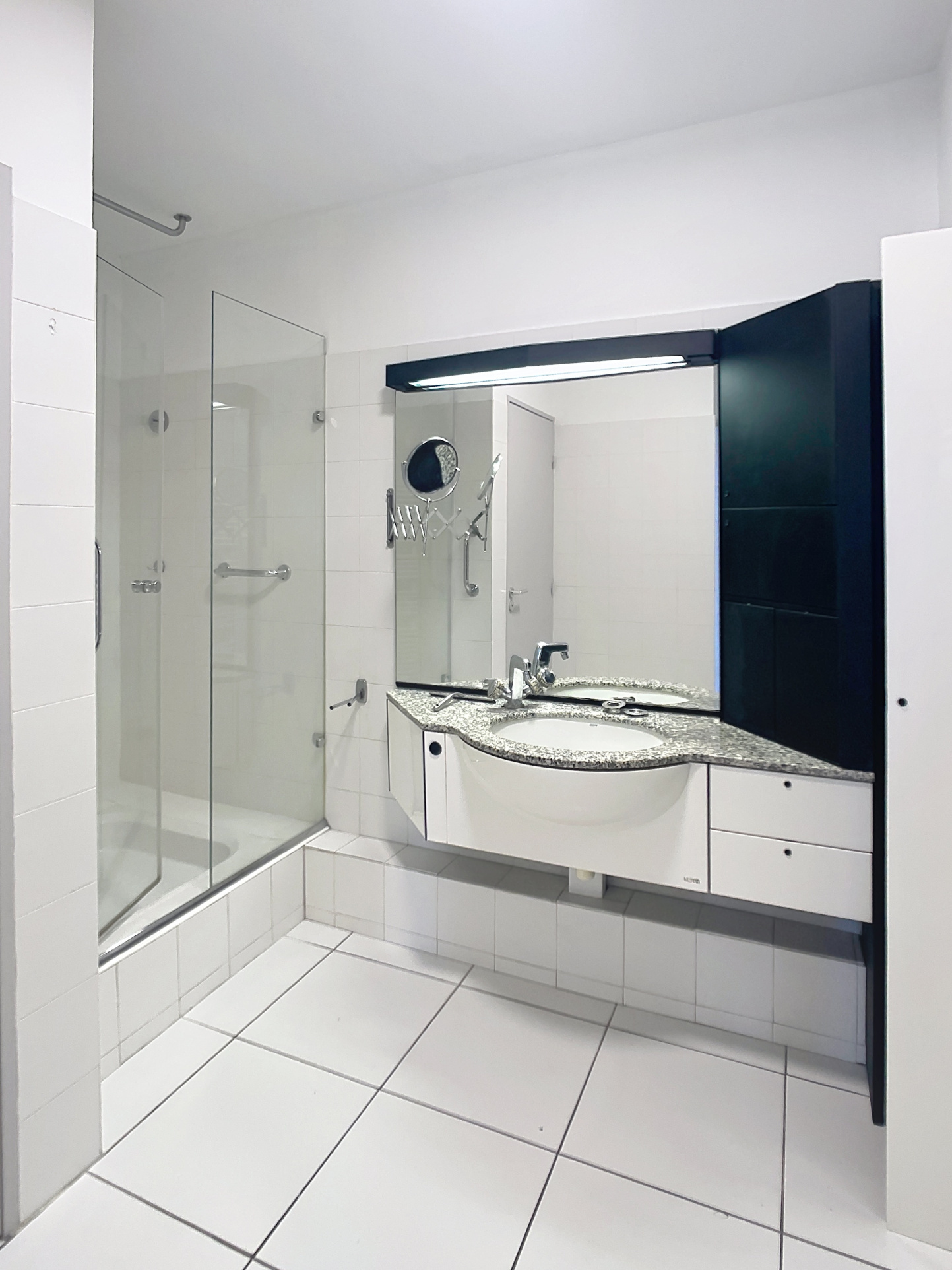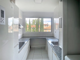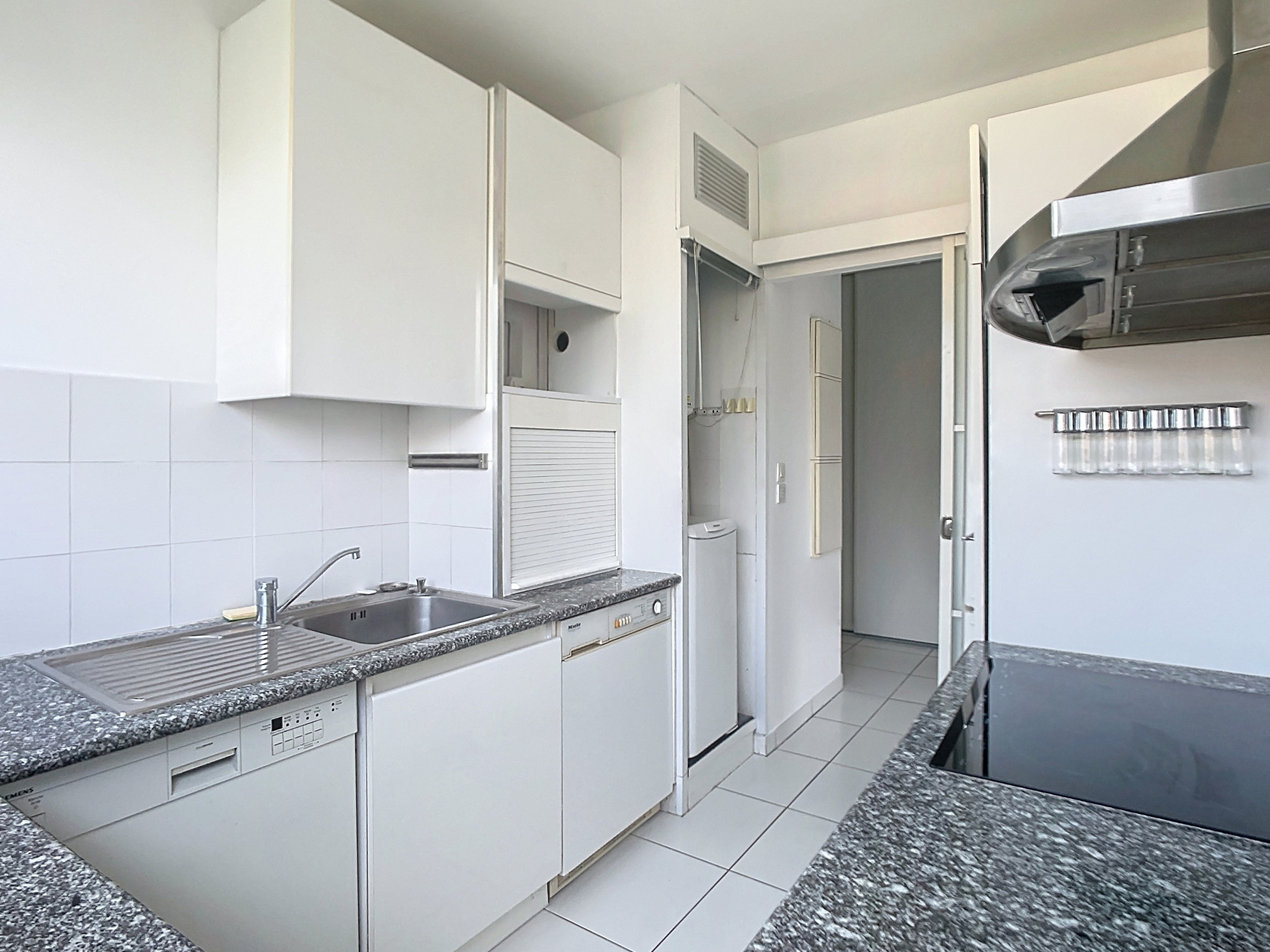 Entrée avec placard, salle d'eau rénovée avec wc, cuisine indépendante et entièrement équipée (lave vaisselle, machine à laver et sèche linge), une chambre avec 2 placards, une loggia fermée disposant d'une grande armoire et un grand séjour baigné de lumière. L'appartement offre une disposition originale, on peut "tourner"!