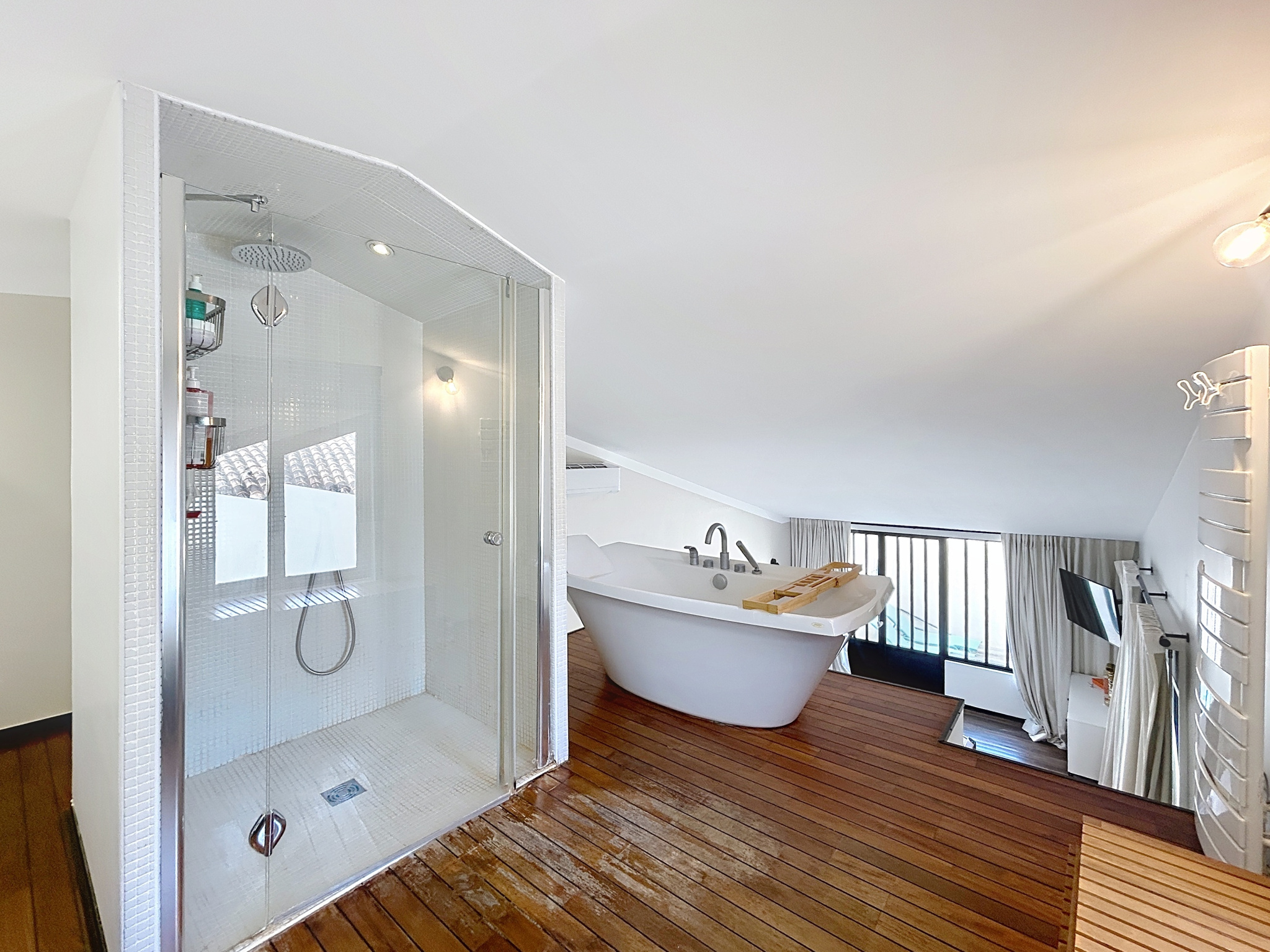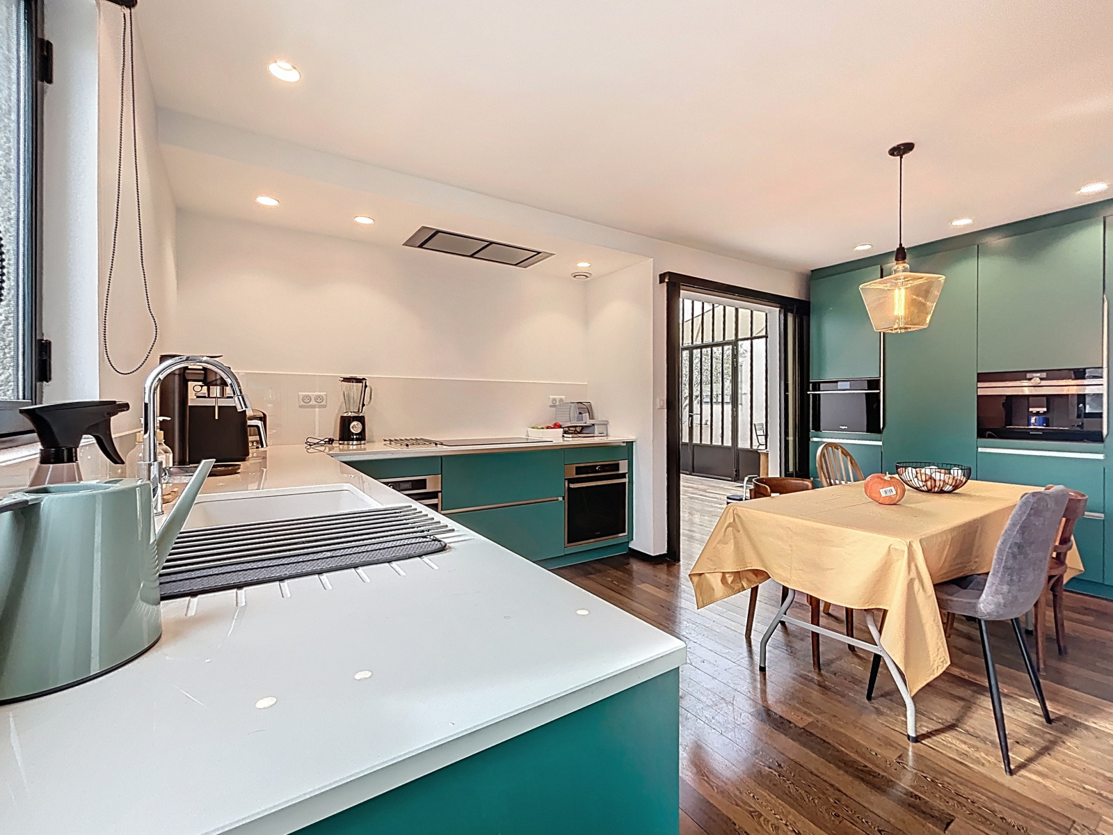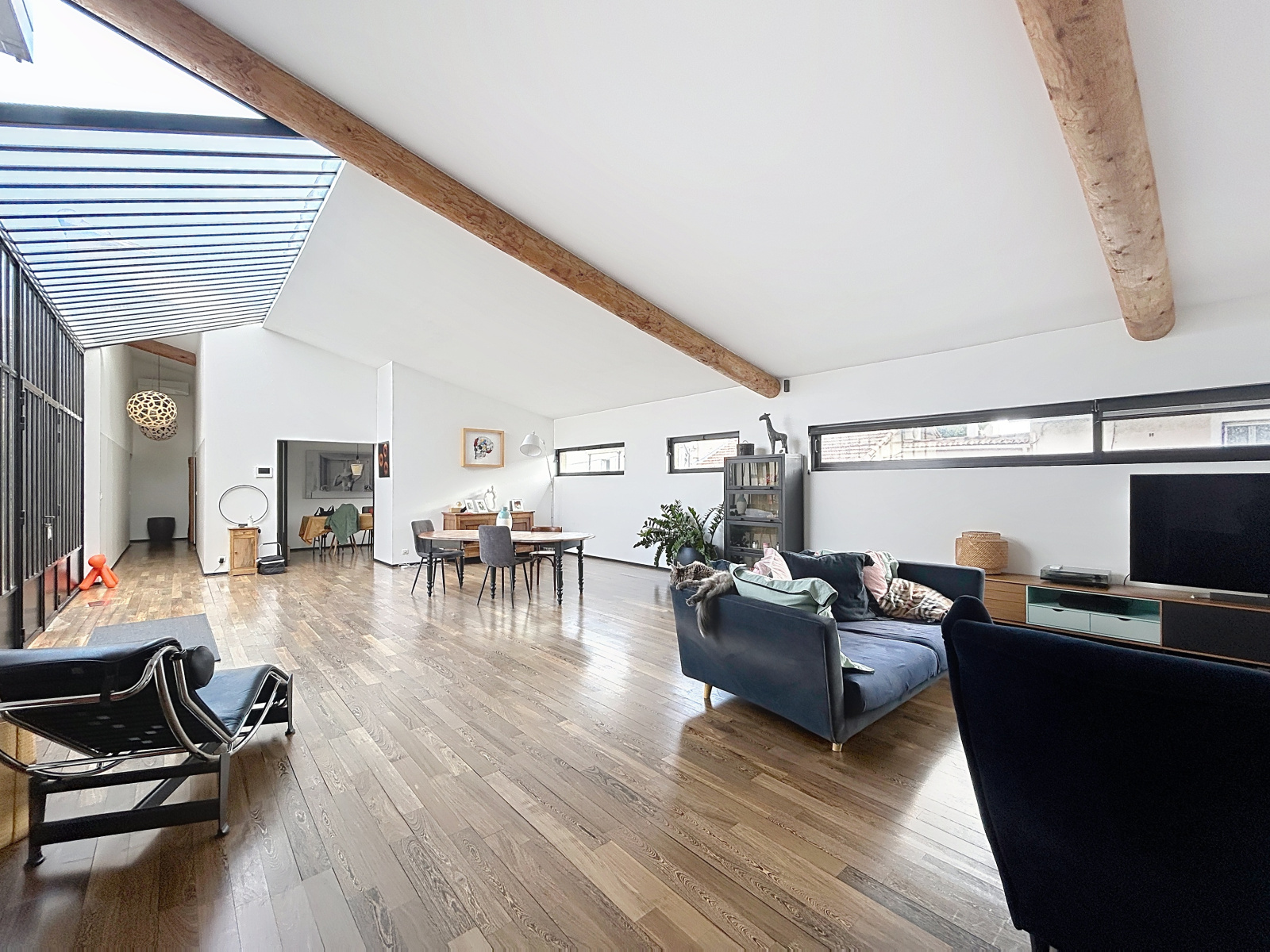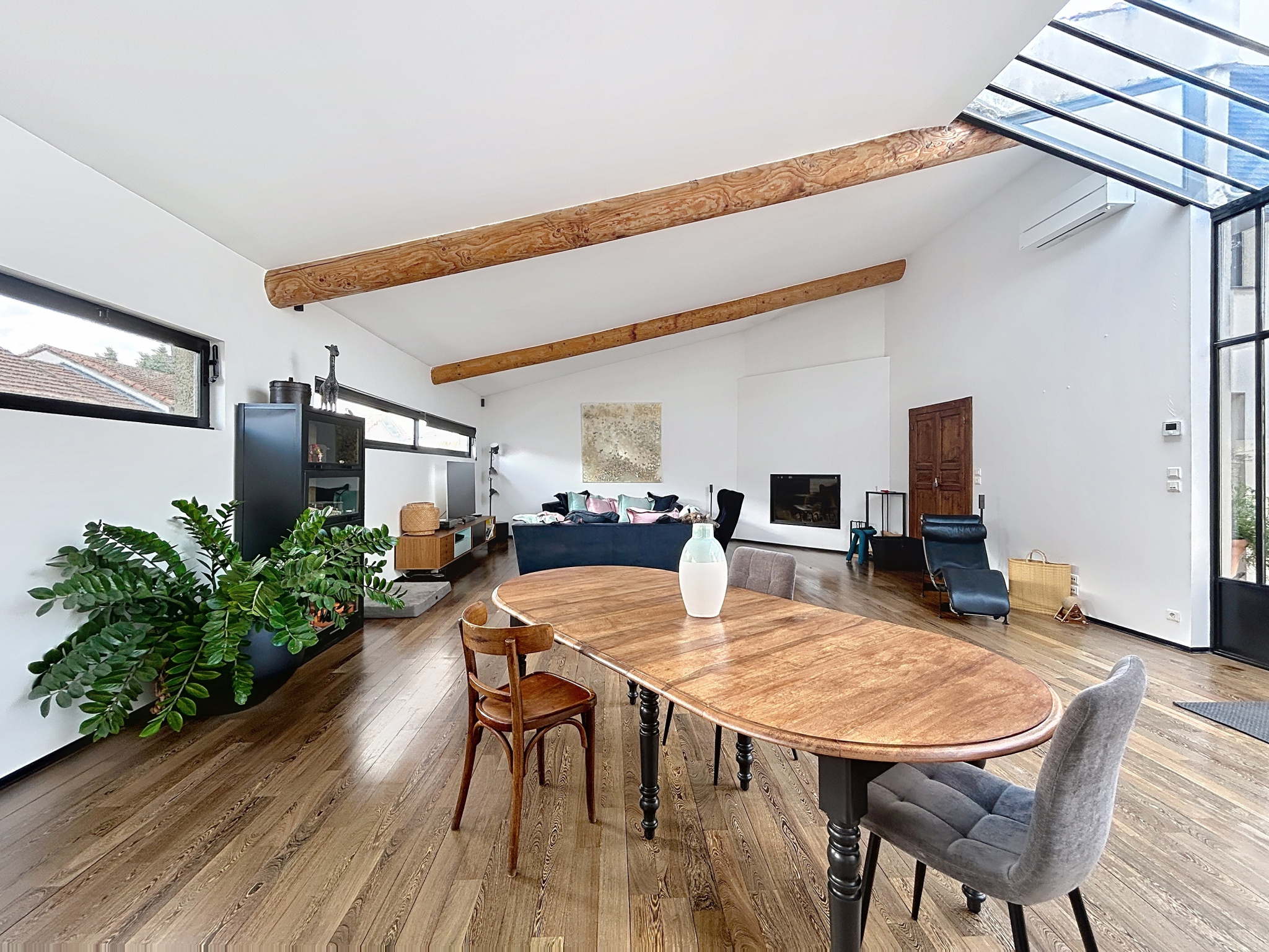 À l’étage, un séjour de 80 m² avec cheminée s’ouvre sous une verrière style atelier, offrant lumière et volumes rares.
