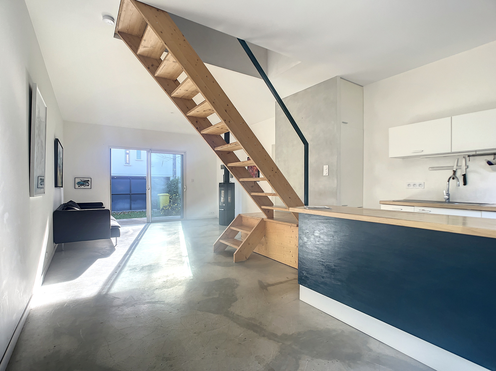 L'habitation principale offre un séjour / cuisine traversant sur un jardin côté Sud et sur une terrasse au Nord.