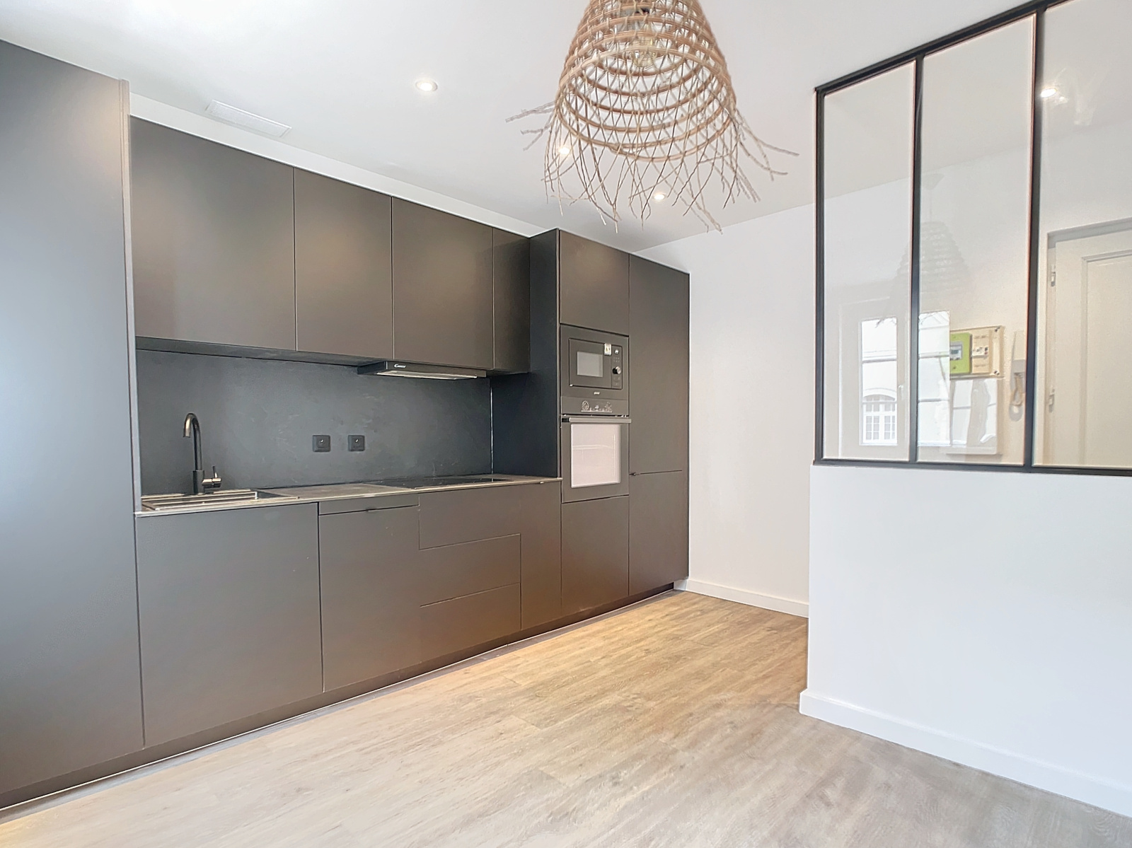Une cuisine avec espace repas entièrement aménagée et équipée, un spacieux séjour, une chambre, une salle d'eau, un WC et des placards de rangement.